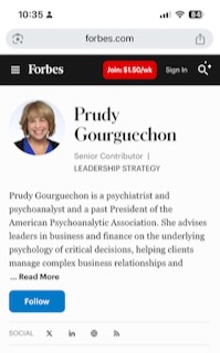 Dr. Gourguechon wrote dozens of articles for the Forbes.com Leadership channel covering a wide range of issues at the intersection of psychology and business. Topics range widely from the psychology of corporate apologies, to retirement and other career issues, to women and power. The articles can be found on the Forbes.Com website\